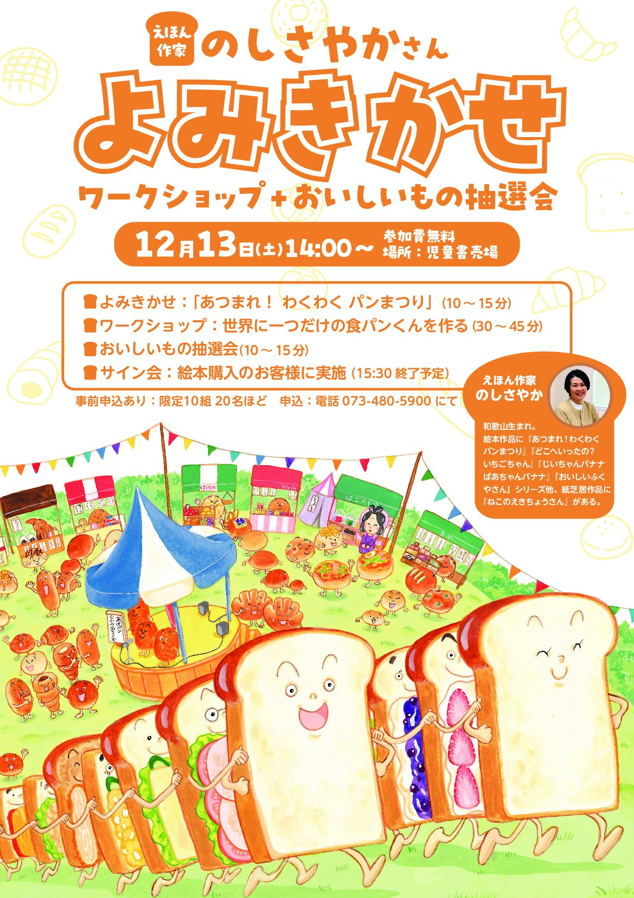 絵本作家のしさやかさんの読み聞かせ会とワークショップをガーデンパーク和歌山店にて開催! 日時:12/13 (土) 14:00~15:30 場所:児童書売場 ・読み聞かせ「あつまれ!わくわくパンまつり」(10分~15分 […]